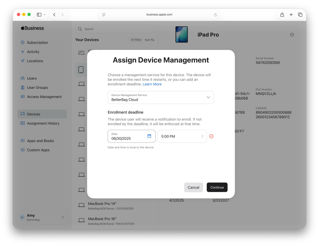 O processo foi difícil porque um único dispositivo só podia transportar um único perfil MDM e os dispositivos bloqueados de inscrição automatizada da Apple para um MDM. A única maneira de migrar era remover um dispositivo do MDM original, limpar o dispositivo (!) E depois reenrolá -lo manualmente com o novo provedor MDM.