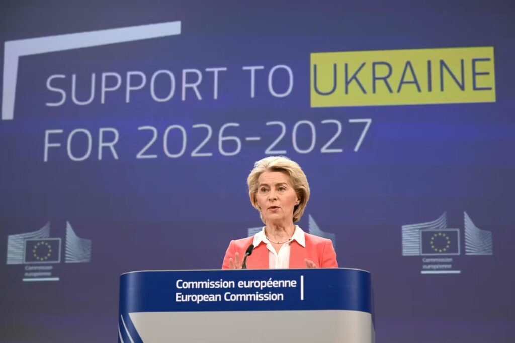 A presidente da Comissão Europeia, Ursula von der Leyen, fala numa conferência de imprensa para apresentar um pacote de apoio
