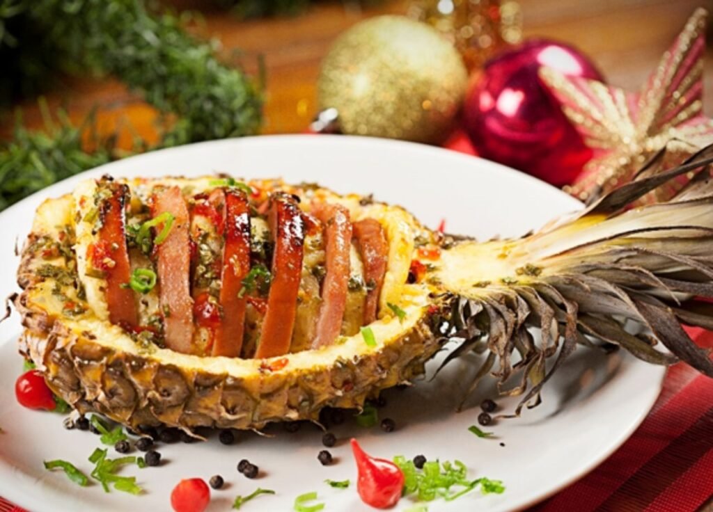 Tender Agridoce no Abacaxi Ingredientes 1 abacaxi do tipo pérola, com casca e coroa, cortado ao meio pelo comprimento 500