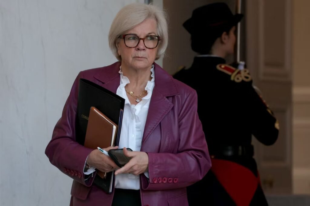 A ministra da Defesa da França, Catherine Vautrin, sai após a reunião semanal de gabinete no Palácio Presidencial do Eliseu,