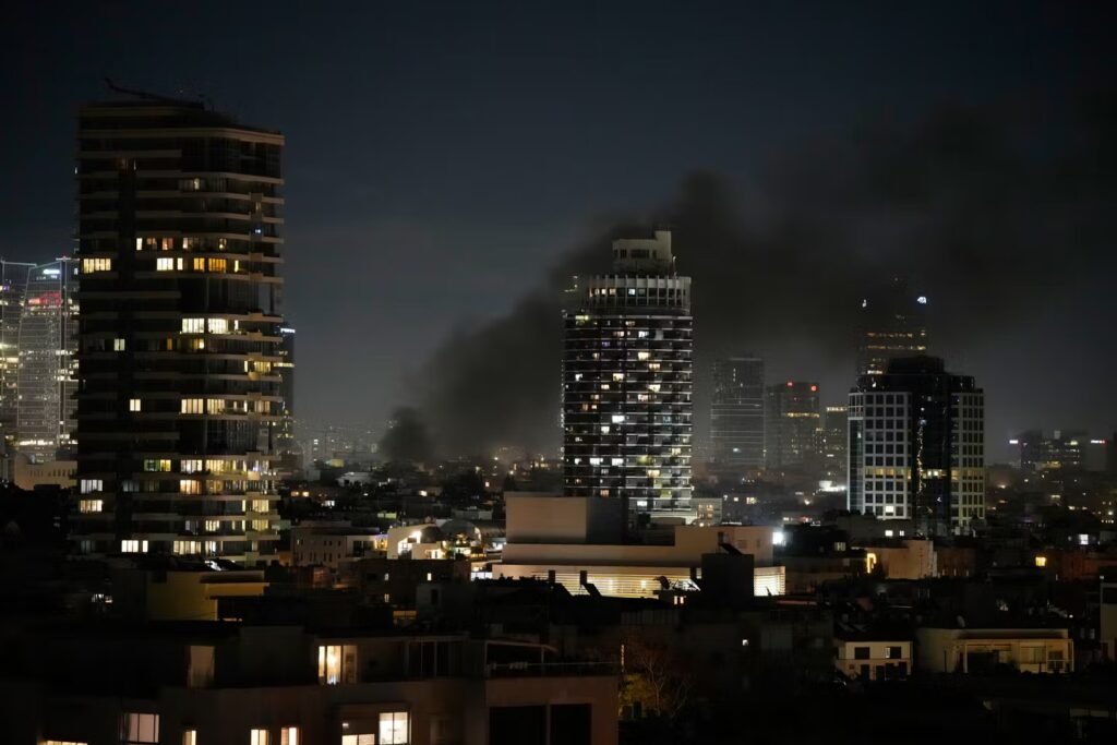 A fumaça sobe após um ataque com mísseis iranianos, Tel Aviv, Israel, 28 de fevereiro de 2026. OHAD ZWIGENBERG/AP Os