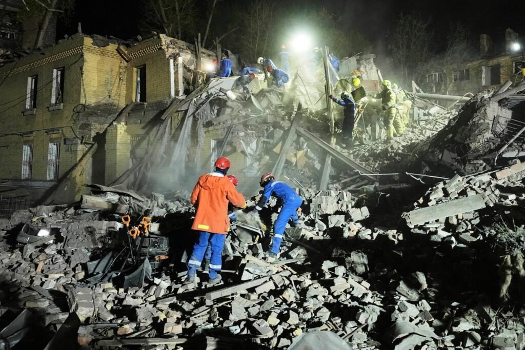 Os pesquisadores ucranianos limpam os escombros após um ataque de mísseis balísticos russos em Kiev, Ucrânia, no início de quinta