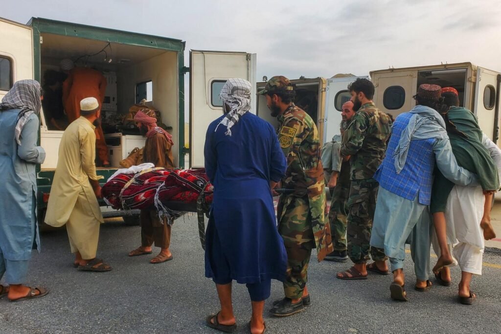 Soldados e civis do Taliban levam o terremoto vítima de uma ambulância em um aeroporto em Jalalabad, Afeganistão, em 1º