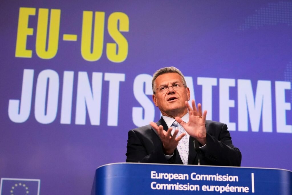 O Comissário Europeu de Segurança Comércio e Econômica, Maros Sefcovic, fala durante uma conferência de mídia na sede da UE