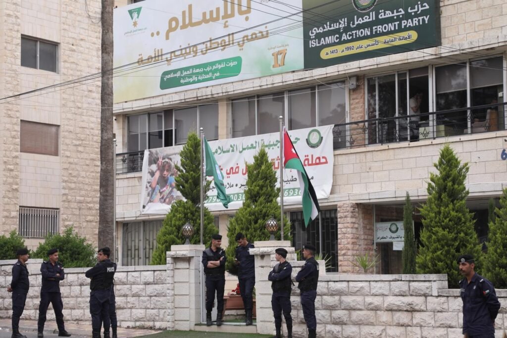 Os policiais da Jordânia em pé em frente à sede da frente de ação islâmica em Amã, Jordânia, em 23