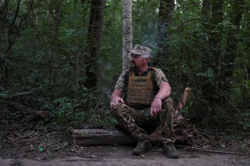 No servidor ucraniano, repousa durante um exemplo militar em um campo de treinamento antes da implantação para uma missão de