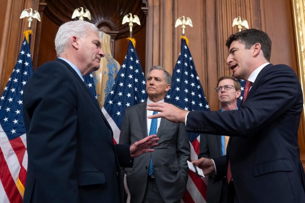 A maioria da casa chicote Tom Emmer, R-Minn., Da esquerda, Presidente de Serviços Financeiros da Câmara, French Hill, R-Ark., Rep.