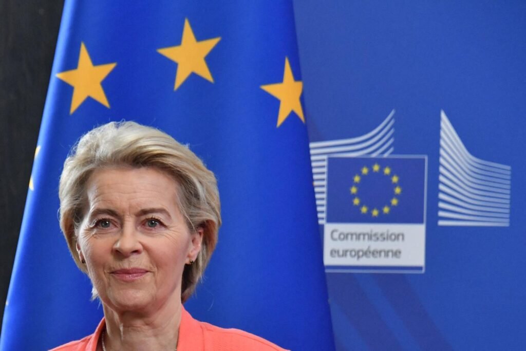 O presidente da Comissão Europeia, Ursula von der Leyen, realiza uma conferência de imprensa, em 3 de abril de 2025.