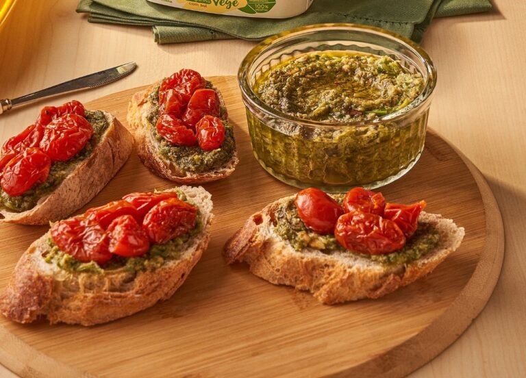 Brusqueta com tomate cereja assado e pesto de talos de vegetais Ingredientes Tomatinhos assados 2 xícaras (chá) de tomate cereja