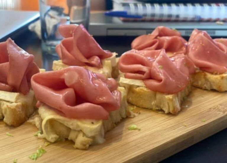 Bruschetta de Mortadela Defumada Ingredientes Fatias de pão Ciabatta 6 fatias de Queijo Brie 5 fatias de Mortadela Defumada Raspas