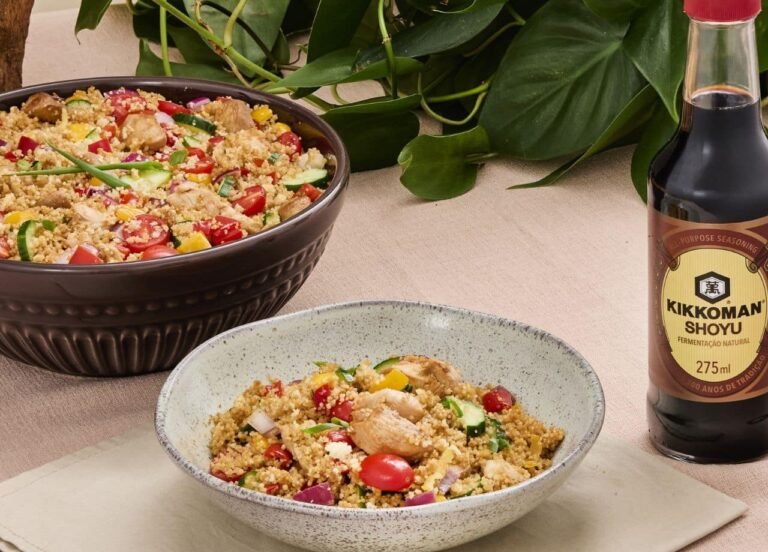 Cuscuz de semolina com Shoyu Kikkoman Ingredientes 2 xícaras de cuscuz marroquino 2 e 1⁄2 xícaras de água 4 filés