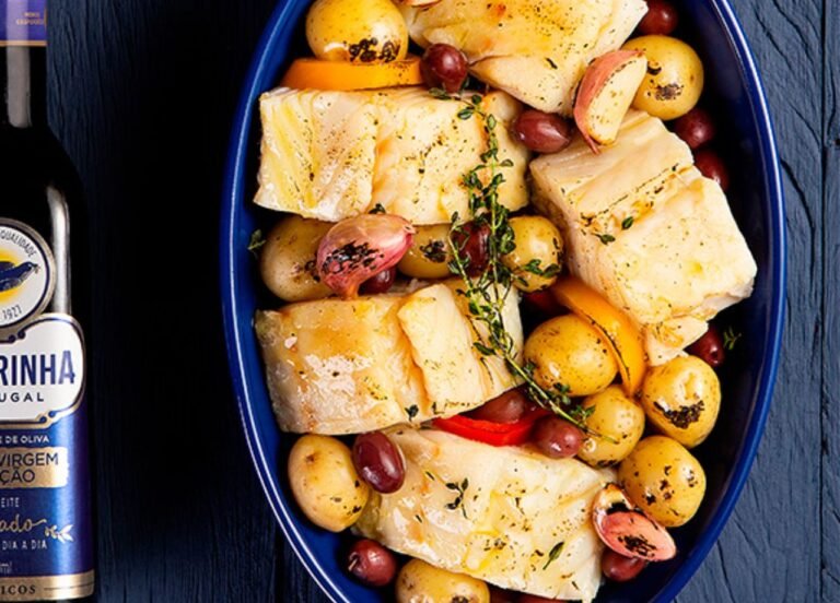 Bacalhoada Ingredientes 1 e ½ xícara de chá de Azeite Andorinha Extra Virgem Seleção 1kg de lombo de bacalhau dessalgado