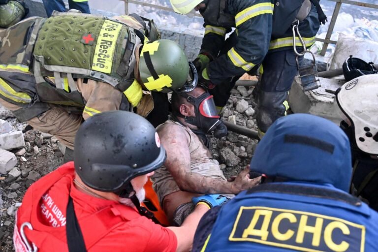As equipes de resgate levam uma pessoa das ruínas de uma fábrica civil após os poderosos ataques da Rússia à