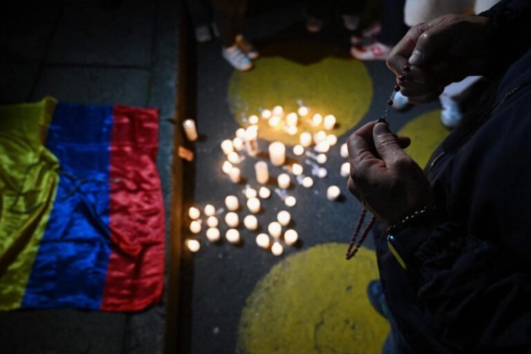 A man Holds a crucifix as he prays outside the clinic fandación santa fe, where senator miguel uribe is receiving