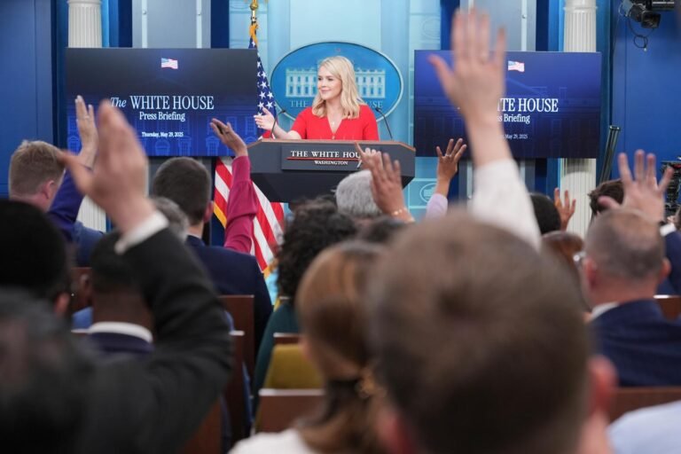 A secretária de imprensa da Casa Branca, Karoline Leavitt, fala com repórteres na Casa Branca, em Washington DC, EUA, na