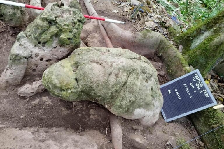 Esta imagem divulgada pelo Ministério da Cultura e Esportes Guatemaltecos mostra duas esculturas antropomórficas de forma ou aparância humana que