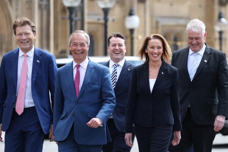 O líder do Partido da Reforma da Grã -Bretanha, Nigel Farage, caminha com a recém -eleita a deputada da reforma