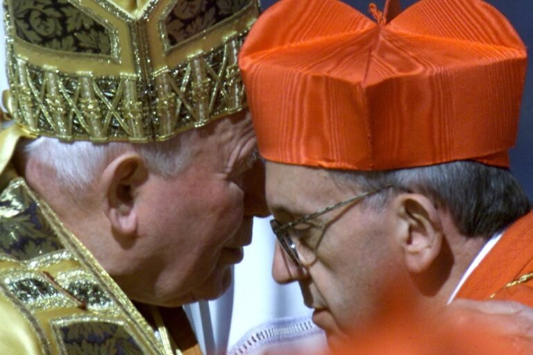 O Papa João Paulo II e o cardeal Jorge Mario Bergoglio, depois de receber a Biretta do Cardinal, um boné