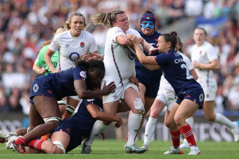 Sarah Bern, da Inglaterra, é abordada durante a partida da União Internacional das Seis Nações de Rugby entre a Inglaterra