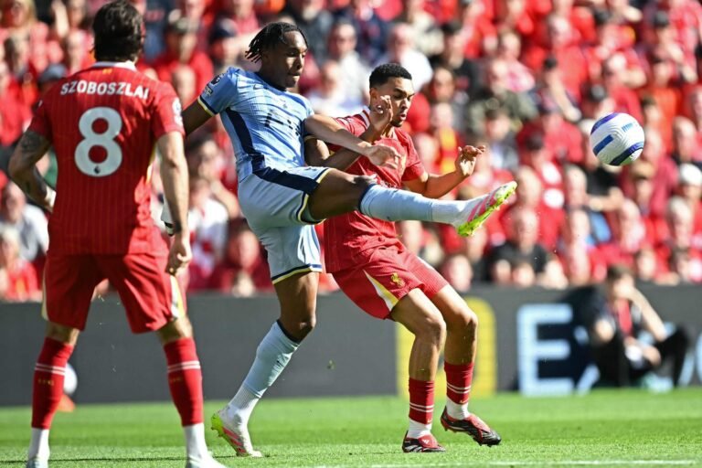 O atacante francês do Tottenham Hotspur #11 Mathys Tel (C) vence com o defensor inglês do Liverpool #66 Trent Alexander-Arnold