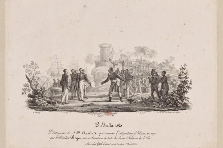 O Barão Ange René Armand de Mackau traz o presidente haitiano Jean-Pierre Boyer, uma ordenança do rei francês Charles X,