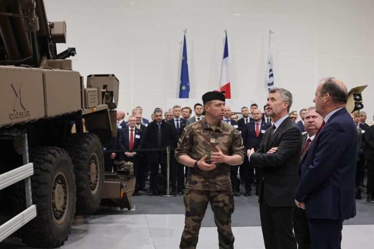 O rei Frederik X da Dinamarca examina equipamentos militares durante sua visita à sede da Nexter Systems, uma subsidiária do