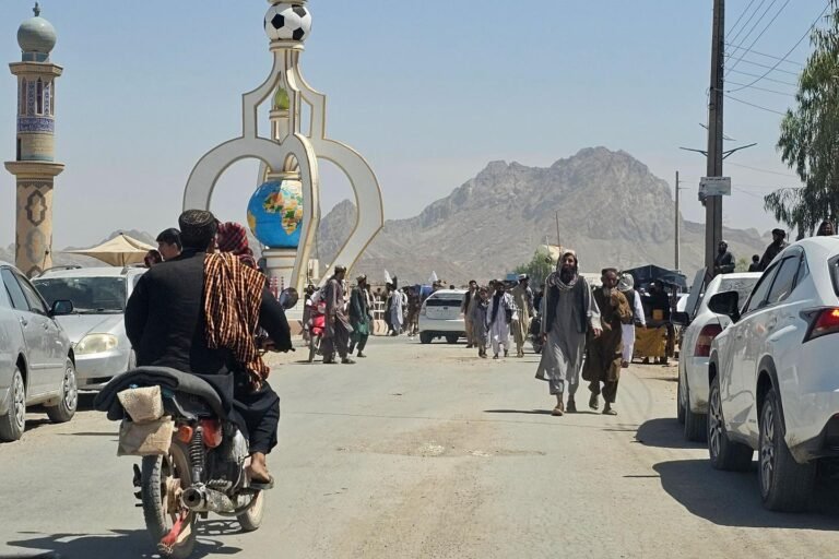 Homens afegãos saem depois de assistir à execução pública de um homem que mantinha um estádio de futebol na província