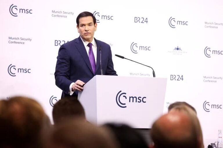 O secretário de Estado dos EUA, Marco Rubio, fala durante a Conferência de Segurança de Munique (MSC) em Munique, Alemanha,