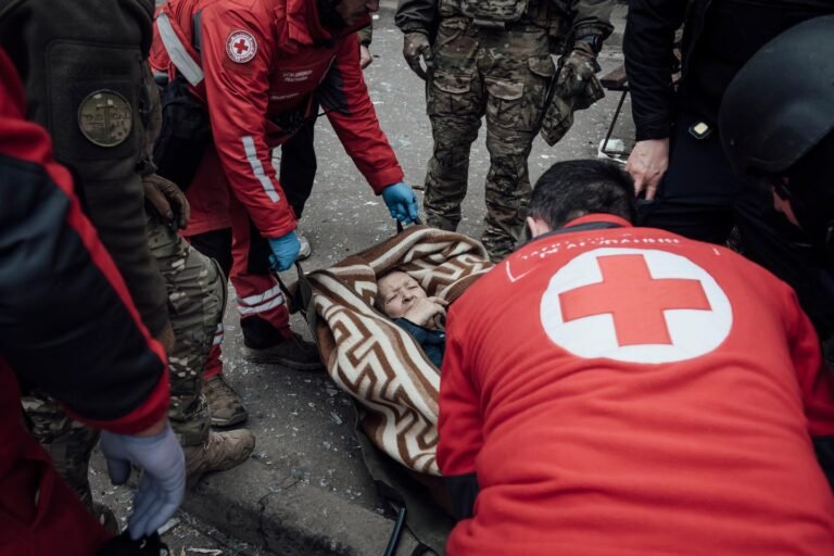 Trabalhadores de resgate e soldados ucranianos evacuam um civil após um atentado russo no centro de Sumy, Ucrânia, em 24
