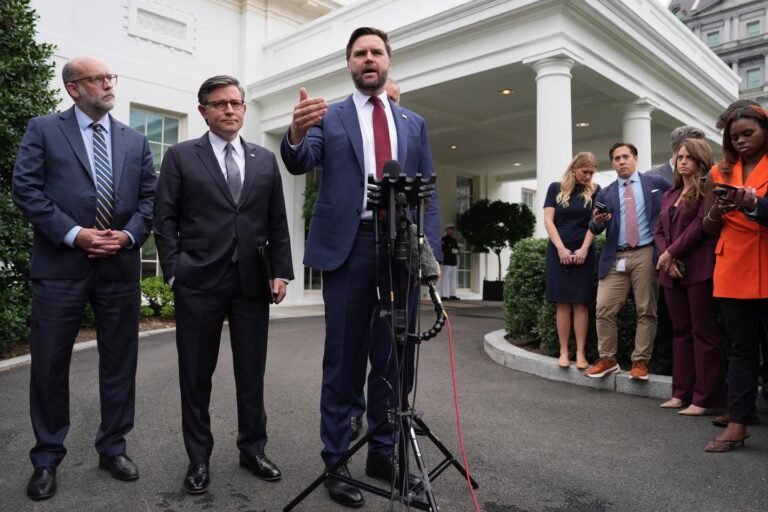 O vice-presidente JD Vance, da direita, o presidente da Câmara, Mike Johnson, R-La., E Russell Vought, Diretor de Administração e