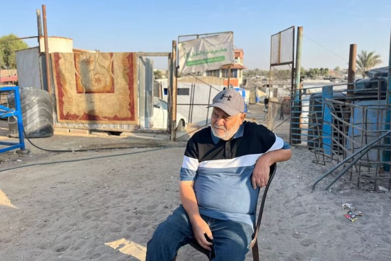 Ahmed Yousef, no campo de Mawasi, no sul de Gaza, dezembro de 2025. COLEÇÃO PESSOAL Abrigado na praia de Mawasi,