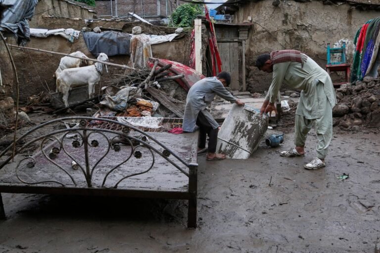 Um pai e sua recuperação de uma máquina de lavar da lama de sua casa, parcialmente destruídos pelas repentinas inundações