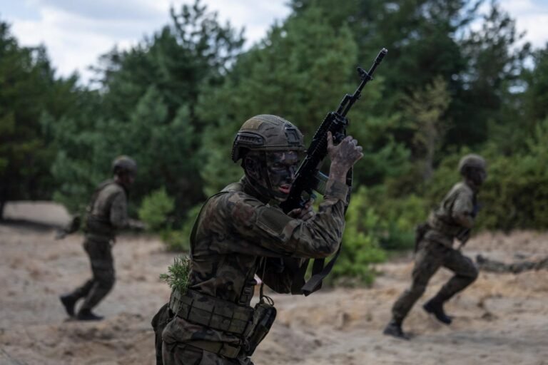 Um estudante participou do projeto de treinamento militar de ‘férias com o exército’ nos subúrbios de Varsóvia em 22 de
