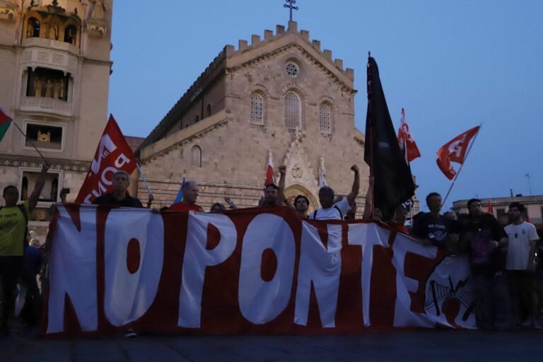 Os manifestantes mantêm uma bandeira lendo ‘No Bridge’ durante a marcha ‘queremos água, não a guerra’ para demonstrar contra a