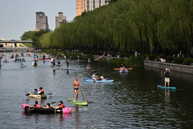 Carta de Pequim O rio Liangma em Pequim, em 15 de junho de 2025. Pedro Pardo/AFP Usando um maiô de