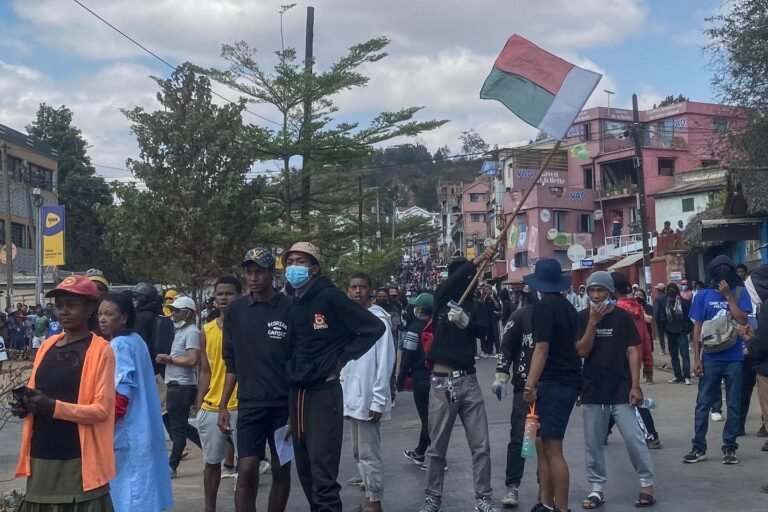 Protestar contra ondas na bandeira de Madagascar durante uma manifestação contra repetidas interrupções na água e na eletricidade em Antananarivo