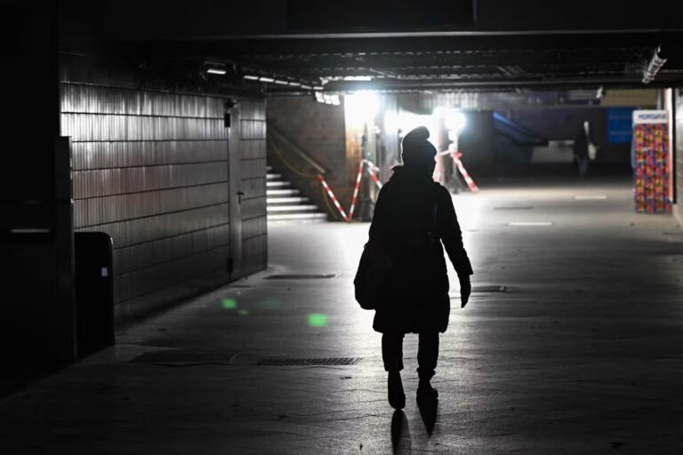 Um viajante caminha ao longo de uma passagem na estação ferroviária Wannsee S-Bahn iluminada pela Agência Federal de Assistência Técnica