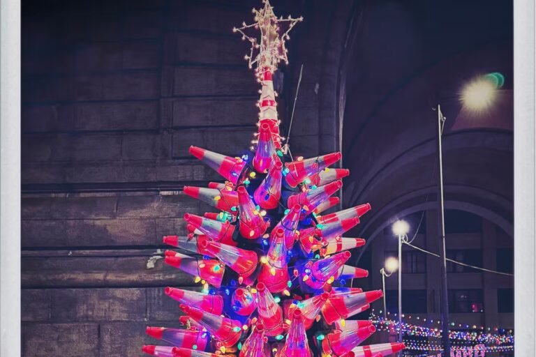 Árvore de Natal de Casey Opstad, decorada com 162 cones de trânsito, em Dumbo, Brooklyn, Nova York, no início de