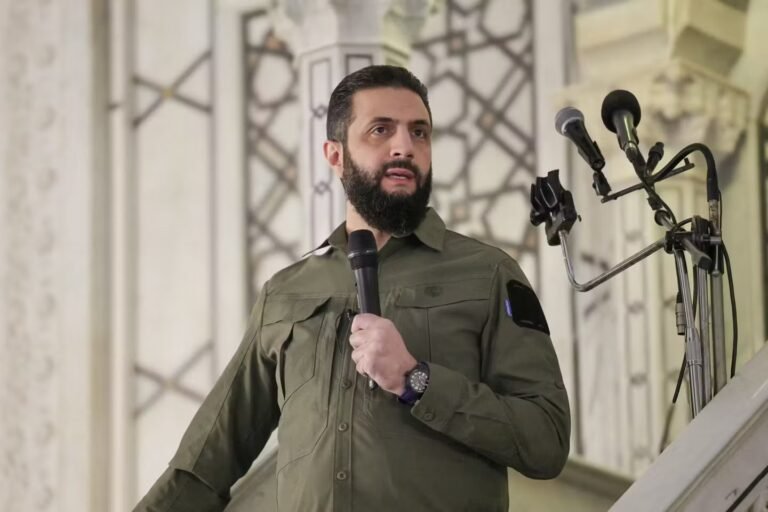 O presidente sírio Ahmad al-Sharaa discursando enquanto participava das orações na Mesquita Umayyad em Damasco, durante o aniversário da deposição