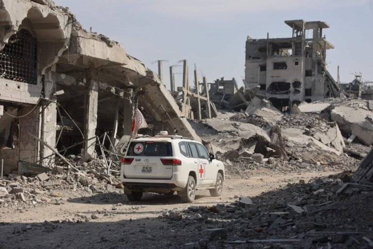 Um veículo do Comitê Internacional da Cruz Vermelha (CICV) passa por um prédio destruído enquanto a busca pelos corpos dos
