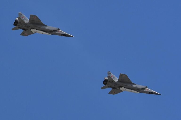 Jatos interceptores supersônicos da Rússia MIG-31 carregando Kinzhal (Dagger) Hipersonic voando sobre mísseis quadrados vermelhos, 9 de maio de 2018.