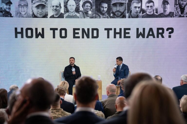 O presidente ucraniano Volodymyr Zelensky no palco no fórum de estratégia europeia de Yalta (sim), mantido anualmente pela Fundação Victor