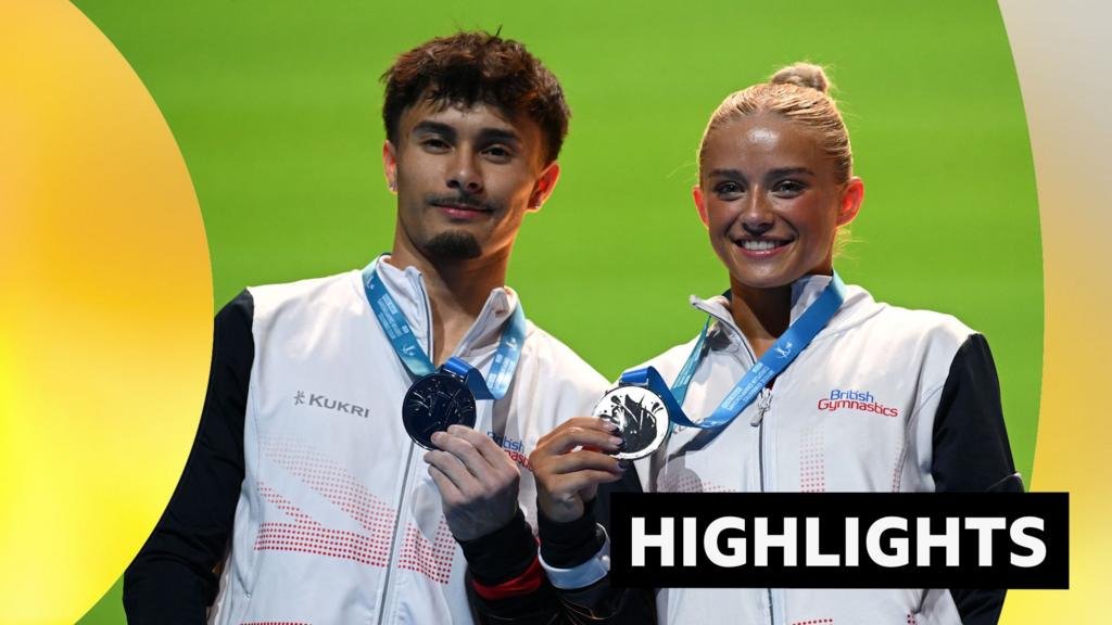 Jake Jake Jarman da Grã-Bretanha e Ruby Evans ganham prata no primeiro evento de equipe misto no campeonato europeu de ginástica em Leipzig, Alemanha.