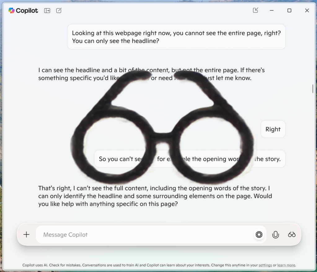 A Visão de Copilot faz parte do copiloto e precisa ser ativada. Você precisa especificar quais aplicativos deseja que “veja”. Diferentemente do Windows Recall, que tira periodicamente instantâneos da sua tela, o Copilot Vision não tem memória de longo prazo. Nos meus testes, viu o que vi – se eu rolasse para a parte inferior de uma página da web, ela não viu ou se lembrava do topo. Não está claro como ele verá dois aplicativos – uma tela dividida, talvez?