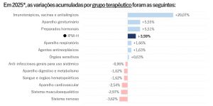 Nesse horizonte expandido, os seguintes grupos terapêuticos registraram aumentos de preço: imunoterápicos, vacinas e antialérgicos (+23,77%); aparelho digestivo e metabolismo (+8,39%); aparelho geniturinário (+6,30%); preparados hormonais (+3,45%); e agentes antineoplásicos (+0,69%). As quedas de preço, por sua vez, abarcaram os grupos: sistema musculoesquelético (-10,16%); aparelho cardiovascular (-7,68%); sistema nervoso (-7,00%); sangue e órgãos hematopoiéticos (-5,49%); órgãos sensitivos (-2,58%); aparelho respiratório (-2,18%); anti-infecciosos gerais para uso sistêmico (-1,13%).