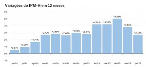 Considerando os últimos resultados mensais, o IPM-H registrou uma alta de 2,72% nos últimos 12 meses encerrados em junho, desacelerando em relação às variações apurados nos últimos 12 meses encerrados em abril (+5,03%) e maio (+3,84%).