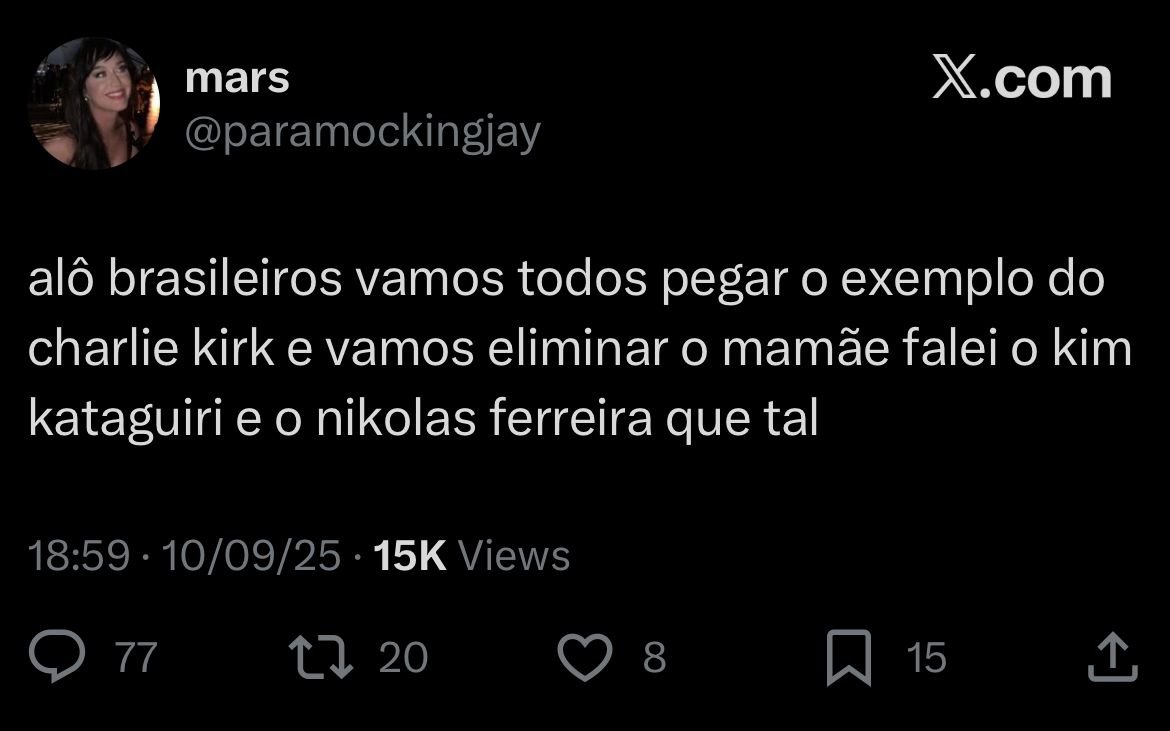 O também deputado federal Kim Kataguiri (União-SP) foi alvo de conteúdos desse tipo. Pelo X, uma internauta tornou público o desejo que aconteça com o parlamentar o mesmo que ocorreu com Kirk, que não resistiu aos ferimentos provocados pelo disparo de rifle que atingiu o seu pescoço enquanto discursava na Universidade Vale de Utah, nos Estados Unidos, no dia 10 de setembro.